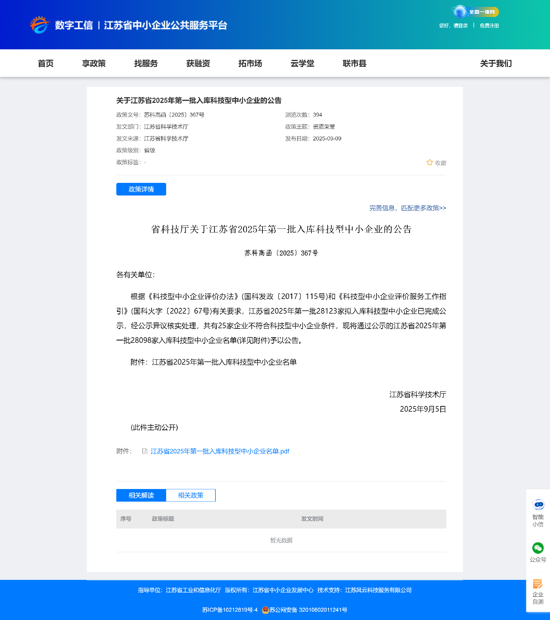 近日,江苏省科学技术厅发布关于2025年第一批入库科技型中小企业名单的公告。江苏智之海科技有限公司经过严格审核与公示程序,凭借在专业洁净室系统、高精密恒温恒湿系统领域的技术积累与持续创新能力成功入选。创新铸就辉煌,未来任重道远 “科技型中小企业”是指依靠科技人员从事研发活动,拥有自主知识产权并将其转化为高新技术产品或服务的中小企业。此次成功入选,彰显了我司在技术创新、产品研发和成果转化方面的沉淀和积累。 关于江苏智之海科技有限公司 江苏智之海科技有限公司创立于2015年,主要从事洁净室、高精度恒温恒湿实验室及实验室家具的设计与安装,涵盖生产工艺布局、车间装修、暖通工程等领域的建设工程设计与施工 [4],业务覆盖电子、制药、生物基因工程等20余个行业 未来,公司将坚持创新驱动发展,进一步发挥自身技术创新优势,通过不断深耕商用洗净领域,以开拓者的姿态不断推进高精密恒温恒湿洁净系统产业向高端化、智能化、绿色化方向发展。